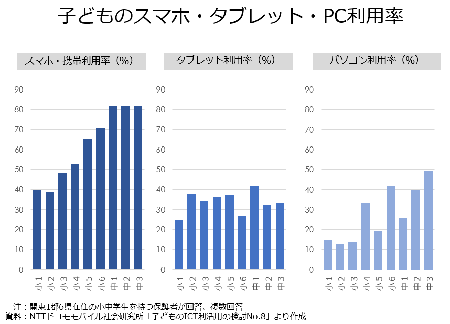 このように見ると、各年代でスマホ・携帯、タブレット、パソコンの順で利用率が高くなっています。特にスマホ・携帯では小学校高学年から利用率の上がり方が高くなり、タブレット、パソコンを大きく引き離しています。