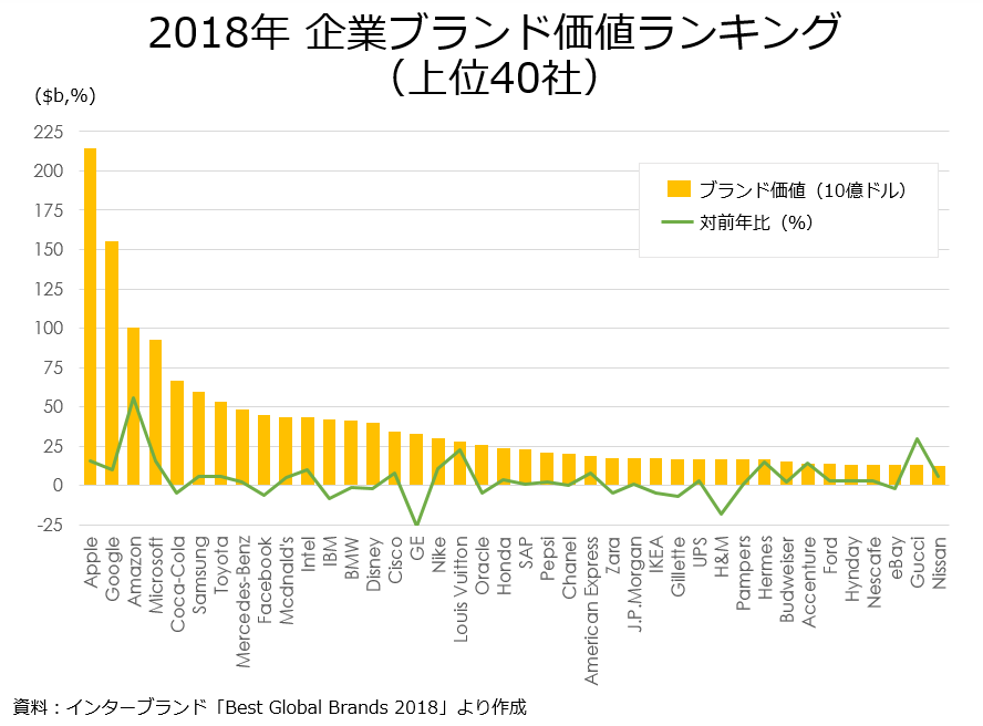 先日、米インターブランド社が、グローバル企業のブラン価値ランキング2018年版を公表しました(※)。2018年版の首位は、米アップル(Apple)で約24兆円(2144億ドル)と、6年連続の首位となりました。