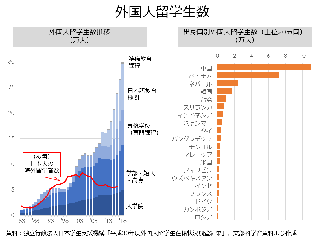 ちなみに、日本人の海外留学生数と比較すると、2001年までは、日本人海外留学生数が日本への外国人留学生数を上回るか、同程度で推移していたのですが、‘02年から外国人留学生数が大きく上回るようになり、圧倒的な差がつくようになりました。