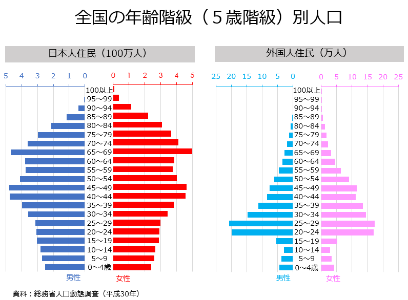 人口ピラミッド構造が、図で見てわかる通り日本人住民と外国人住民で対照的ですが、日本人住民(左図)は100万人単位で見ているのに対し、外国人住民(右図)が万人単位となっていることに気を付ける必要があります。まだまだ日本人の若い世代の先細り感を外国人住民で補うレベルには程遠い状況です。