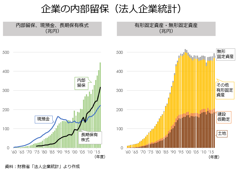 まず、「内部留保」を見ると、60年から増加トレンドで、90年以降のバブル崩壊で横ばい傾向となります。その後2006年に急上昇し、以降概ね増加トレンドでしたが、アベノミクスが始まった2012年以降増加ペースが加速しています。