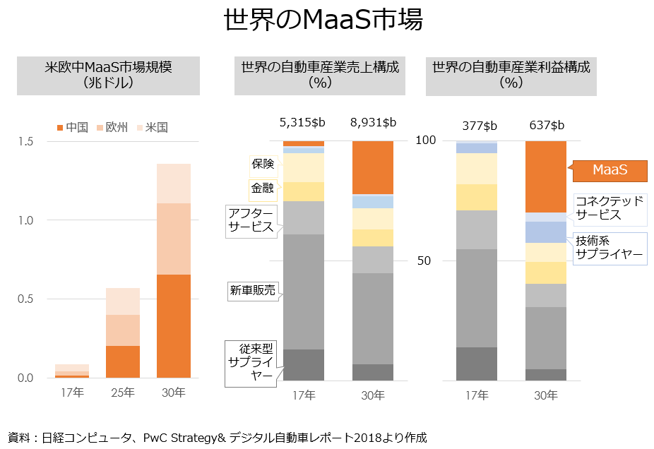 PwCネットワークの戦略コンサルティングを担うStrategy&の公表した「デジタル自動車レポート2018」によると、MaaSの市場規模が2030年に米欧中3地域合計で1兆円を超える(1.36兆ドル、約150兆円)に達すと予測されています。