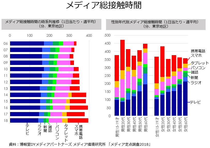 同調査は2006年からの推移のデータが掲載されており、2018年のメディア総接触時間が396.0分(1日当たり、週平均)と過去最高を記録しました。毎年定期的に発表されているデータなので、ご覧になったことがある方も多いかもしれませんね。