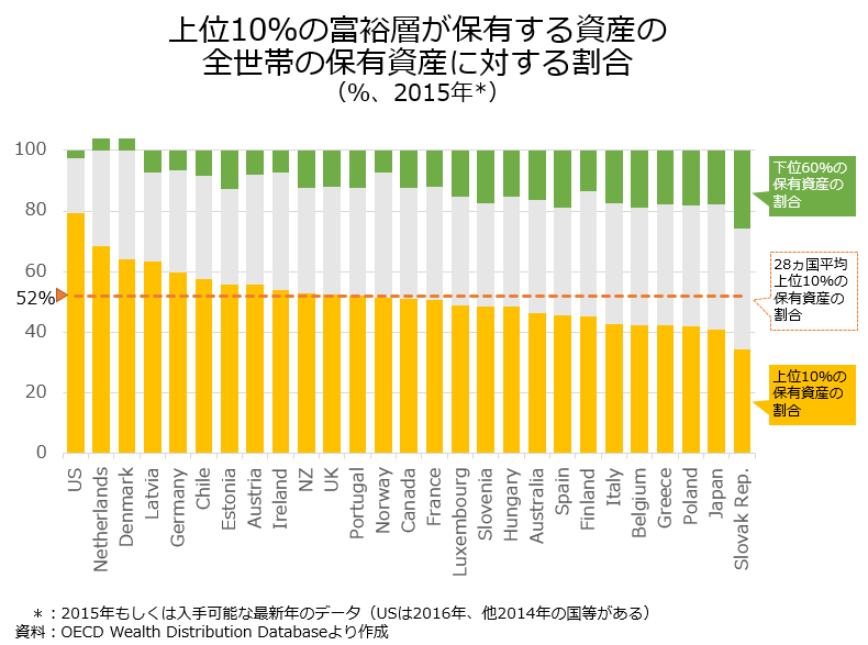 同分析では、保有資産上位10%世帯が保有する資産の、全世帯が保有する資産に対する割合が、約52%(28ヵ国の平均値)であることが明らかになりました。